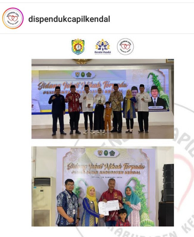 Selasa, 16 Januari 2024. Sidang Isbat NIkah Terpadu yang dilaksanakan oleh Pengadilan Agama berkolaborasi dengan KUA dan Dukcapil Kendal. Dalam sidang ini ada 18 pasang yang telah dinikahkan, hasil dari kegiatan ini, pasangan yang sudah resmi menikah pulang membawa dokumen dari KUA seperti buku nikah, dan dokumen dari Dukcapil seperti KK, KTP, Akta Lahir, dan KIA